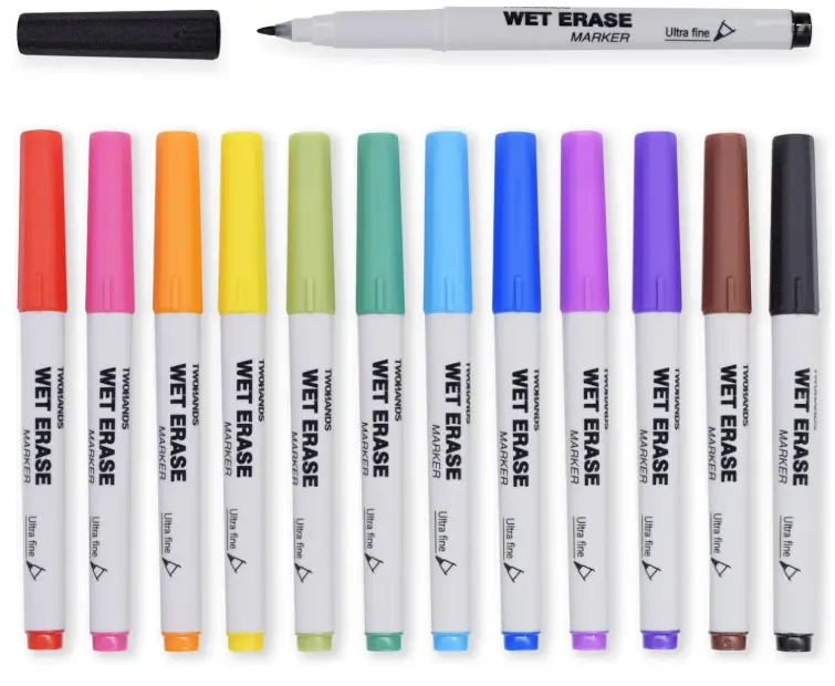 TWOHANDS Wet Erase Markers Ultra Fine Tip,0.7mm,Low Odor,Extra Fine Point,12 Assorted Colors,Whiteboard Markers for Office,Home,or Planning Dry Erase Board,20703